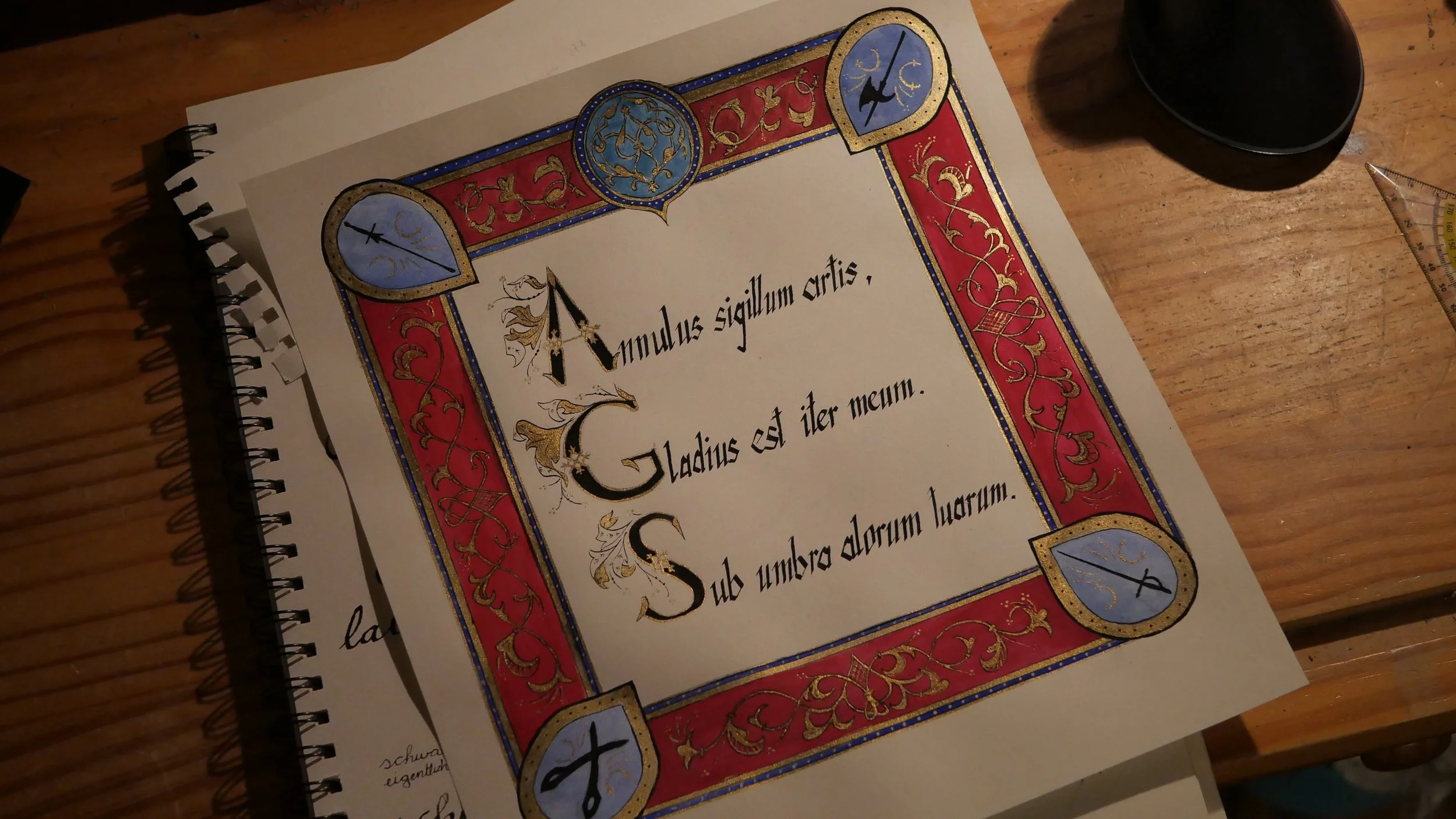 Die fertigen Designs können digital ausgearbeitet oder traditionell auf Papier, Pergament oder Holzschild umgesetzt werden.