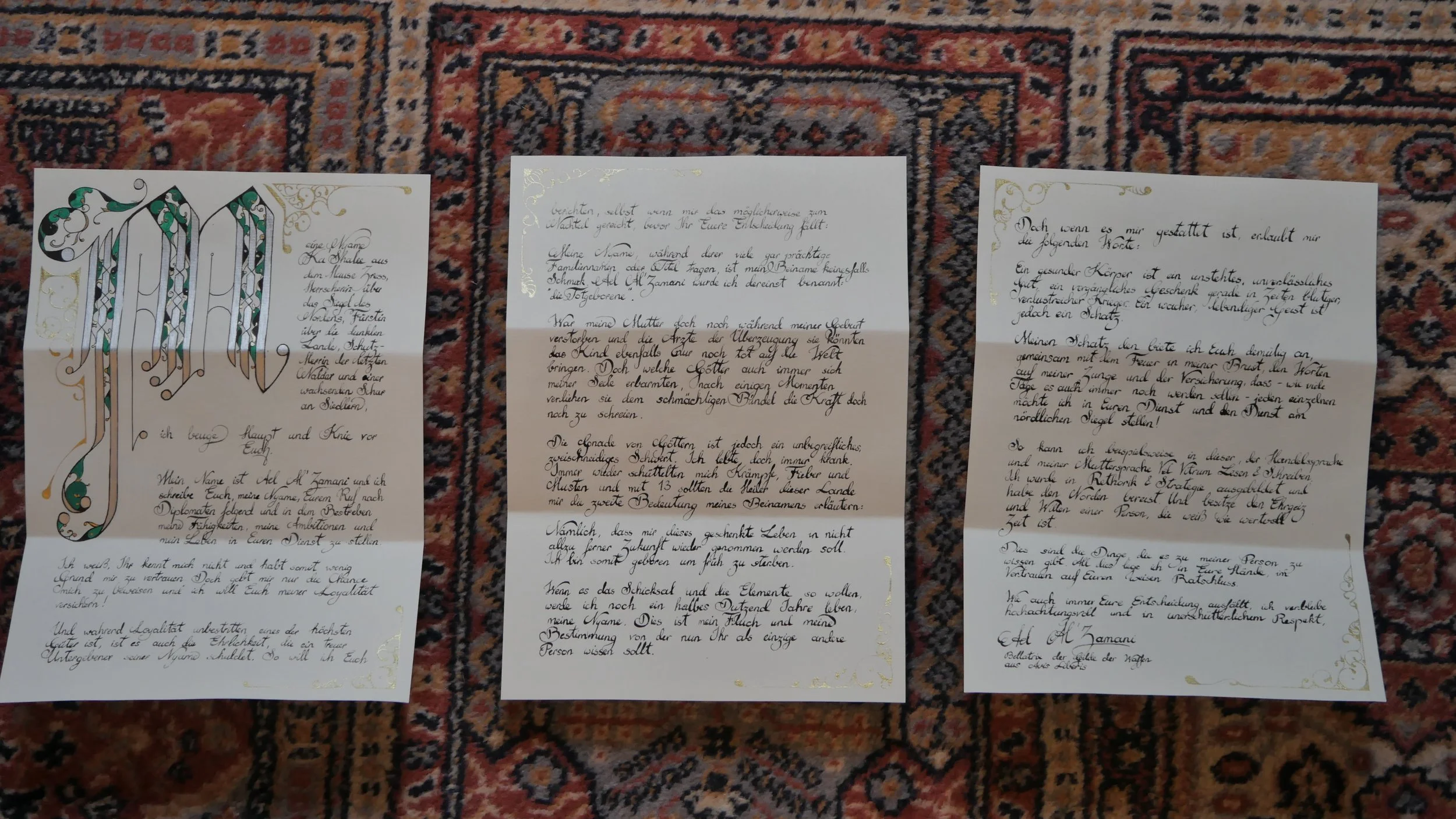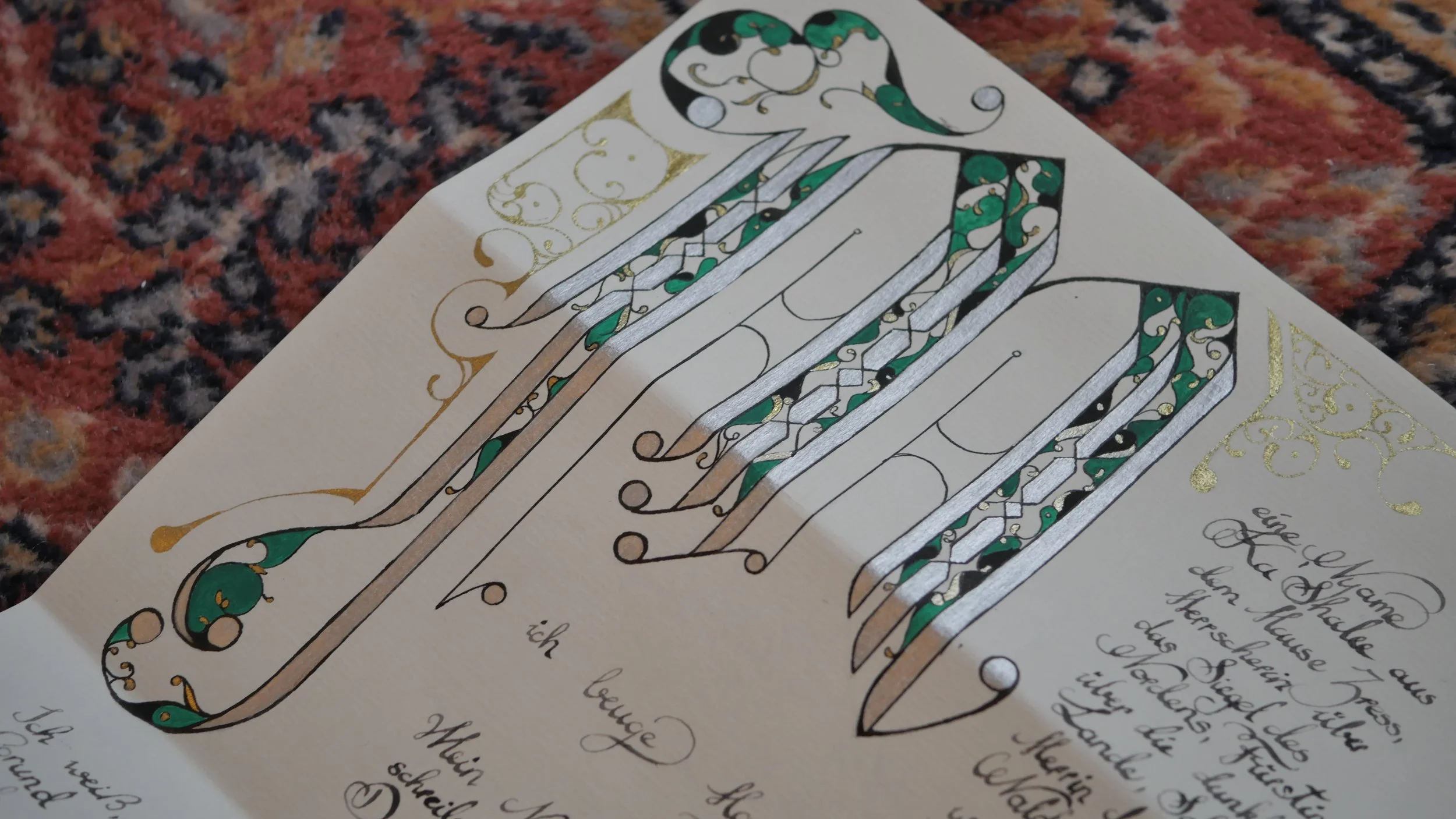Mit Feder und Pinsel fertige ich individuelle Schriftstücke und Dokumente nach Wunsch – von liebevoll gestalteten Briefen und Umschlägen bis hin zu Urkunden, Einladungen oder offiziellen Schreiben.